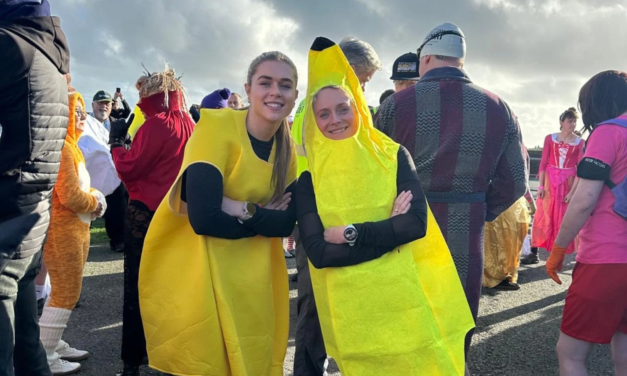 We got into our banana costumes and joined dozens of others, including French Maids, Aliens, and Mario Brothers in a mad dash around part of the circuit, down the hillside, into the Irish Sea for a quick dip, and back up to the track to finish in the pits.